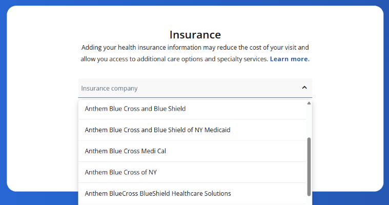Step 2: Choose Anthem Blue Cross Blue Shield from the drop-down menu. Enter your Member ID number from your insurance card.